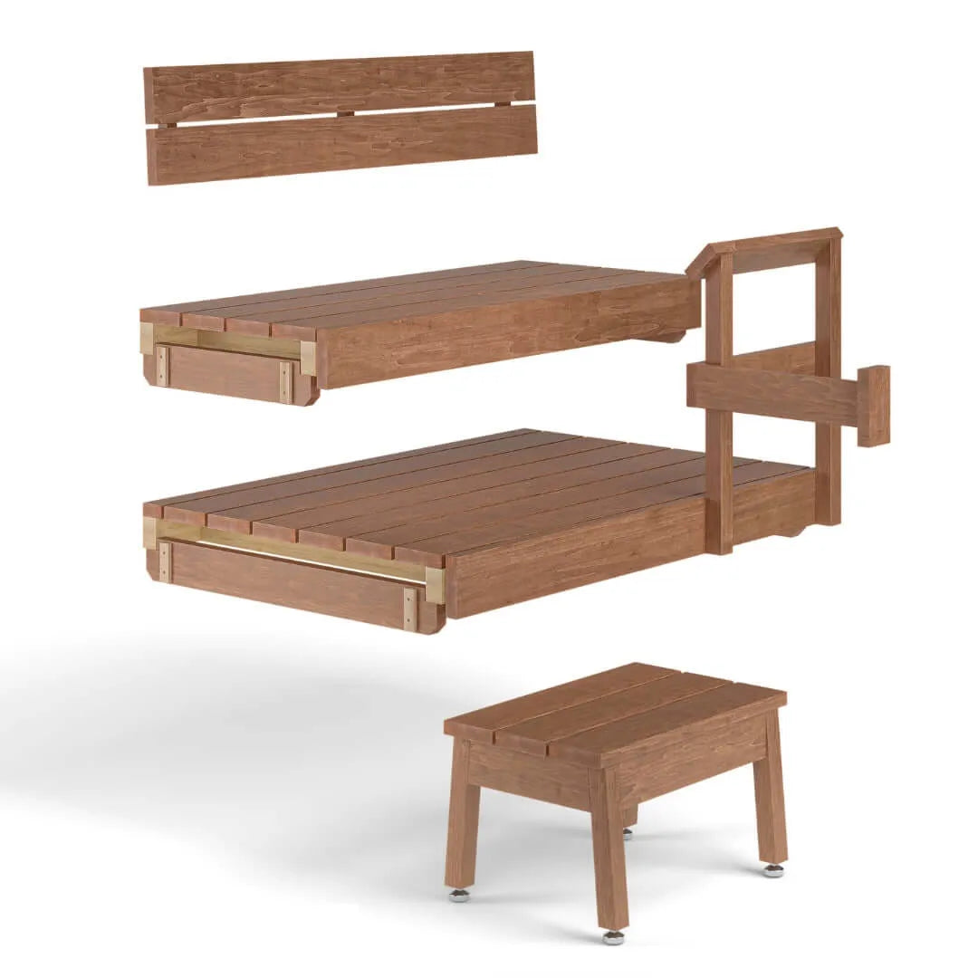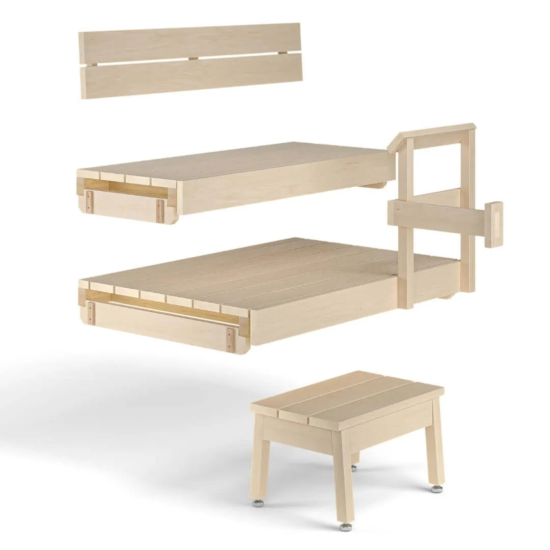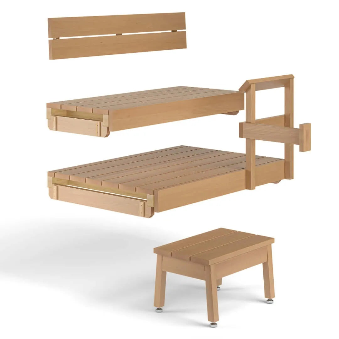 Das Bankpaket enthält neben den Bänken auch einen Hocker, einen Ofenhandlauf und Bankhalterungen.