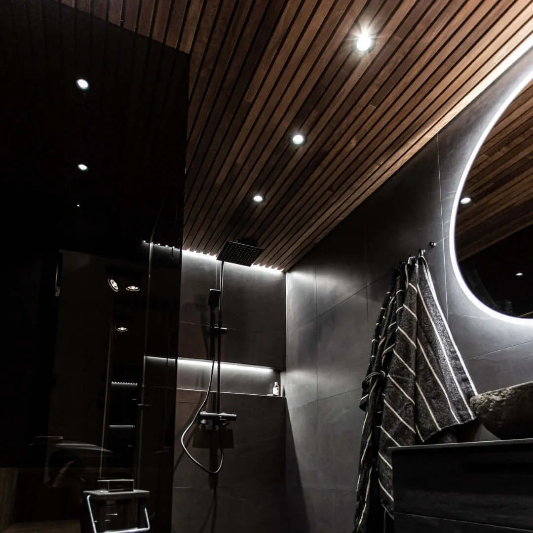 Die aus thermisch behandelter Espe hergestellte Decken-/Wandlatte ist eine einfache und langlebige Wahl für trockene und feuchte Räume im Haus.