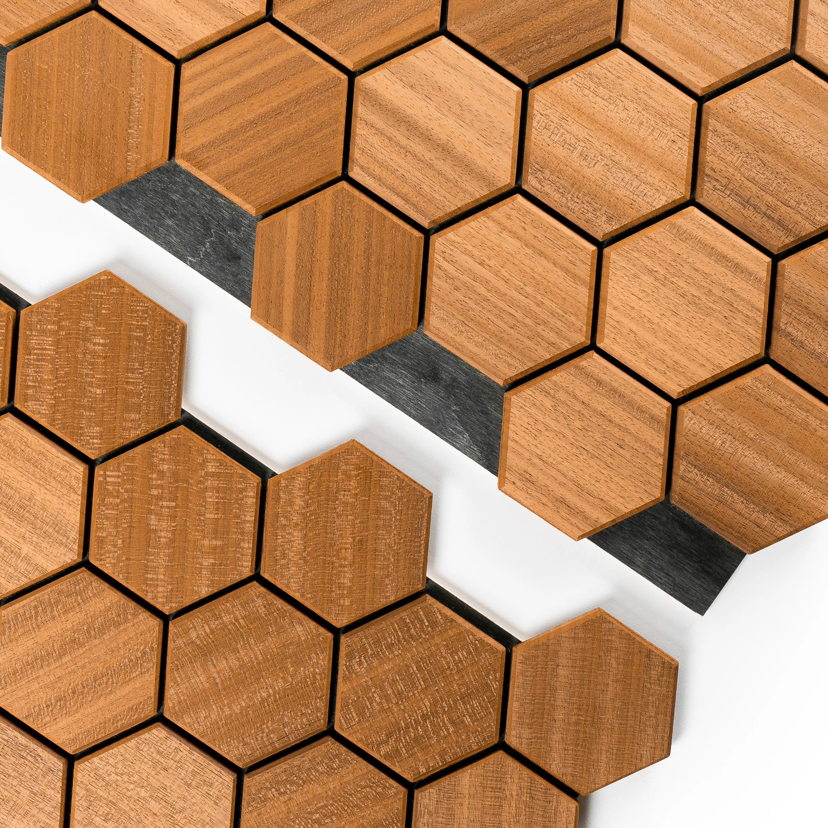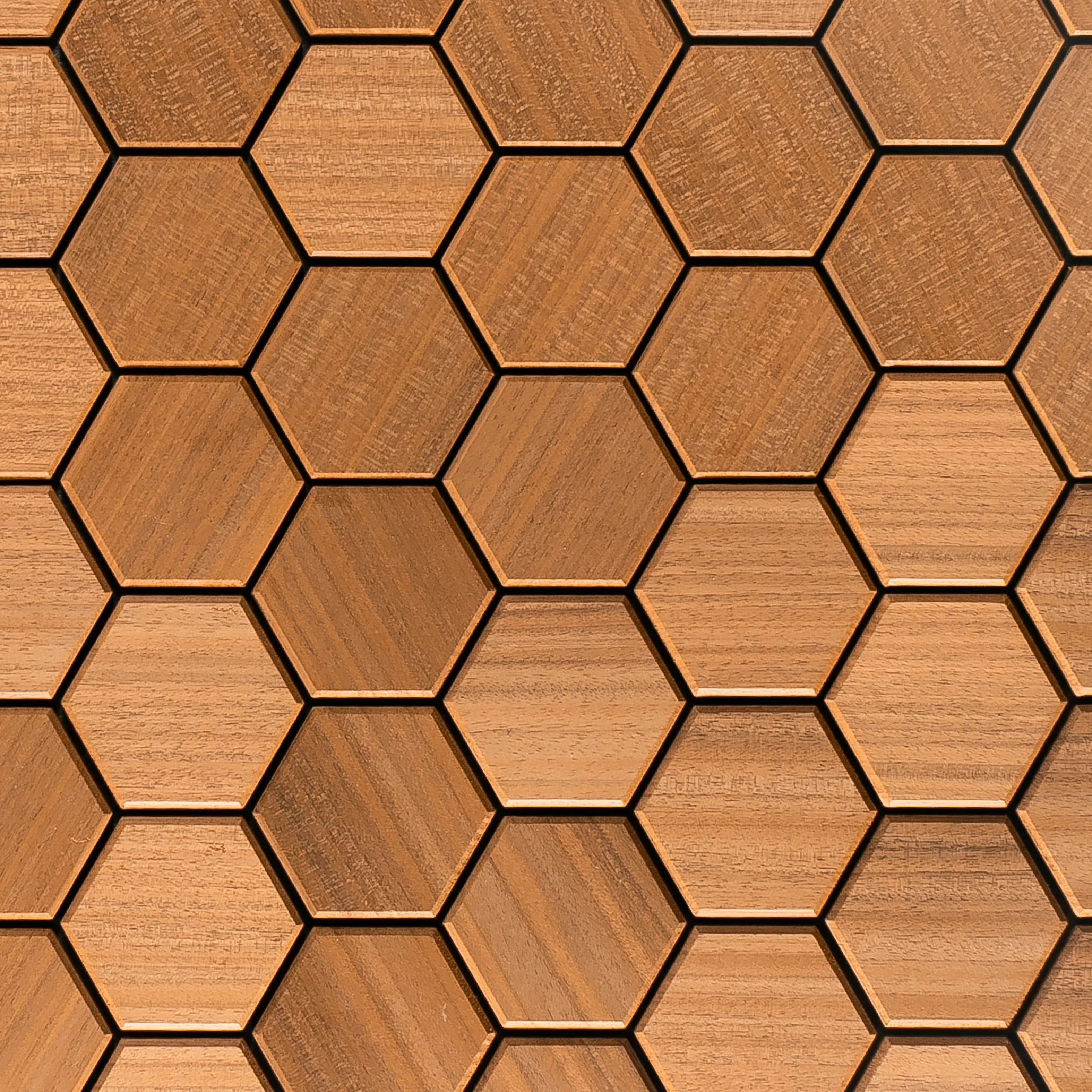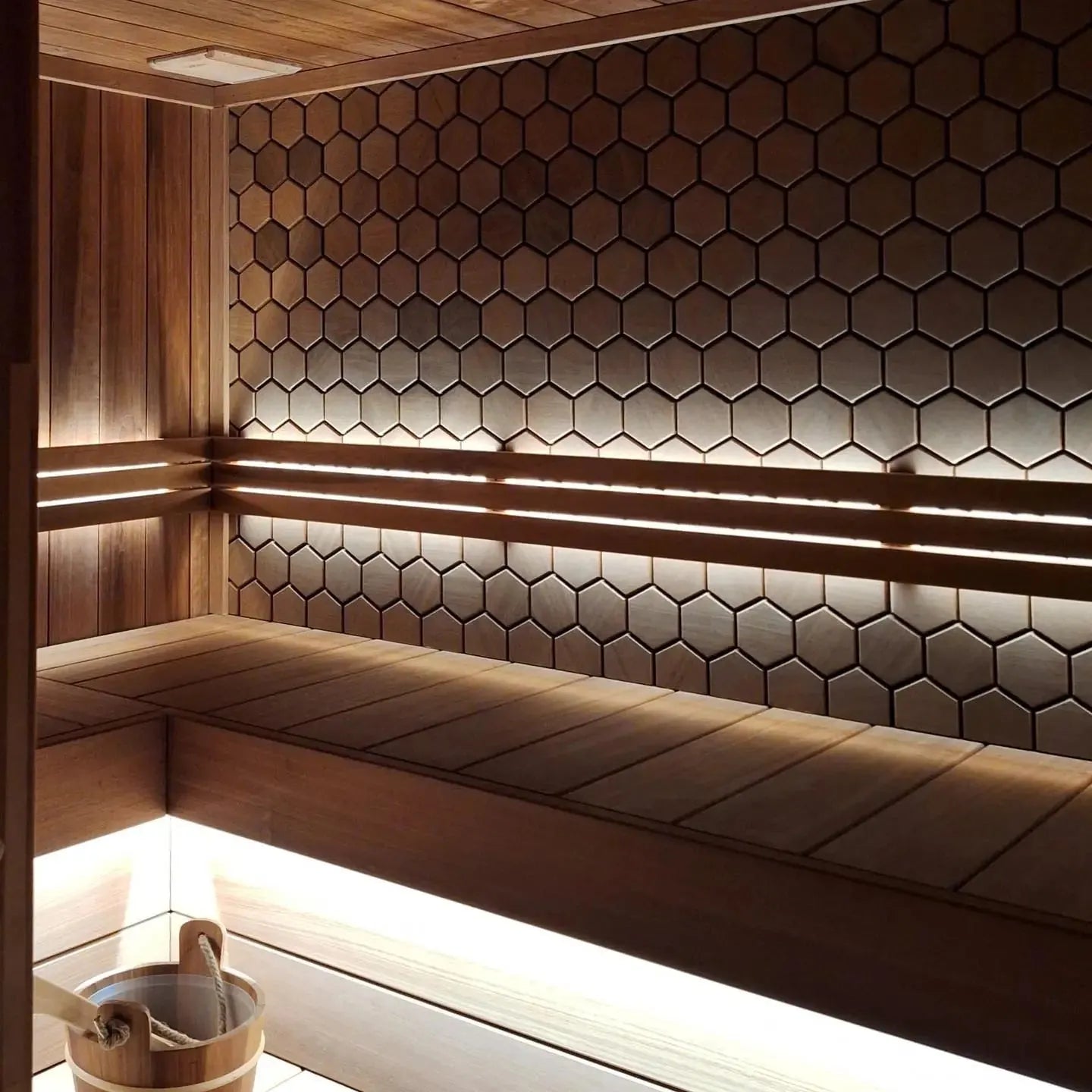 Hexa S Wandpaneele sind hochwertige Dekorpaneele von DecNord. Sie bestehen aus hochwertigem Abachi-Holz und wurden speziell entwickelt, um die Ästhetik von Saunen und anderen Innenräumen zu verbessern. Die Paneele sind in vier verschiedenen Ausführungen erhältlich, jede mit ihren eigenen optischen Merkmalen und ihrem eigenen Charakter. Die Paneele haben die Form regelmäßiger Sechsecke und verleihen dem Innenraum eine angenehme und geometrisch harmonische Note.