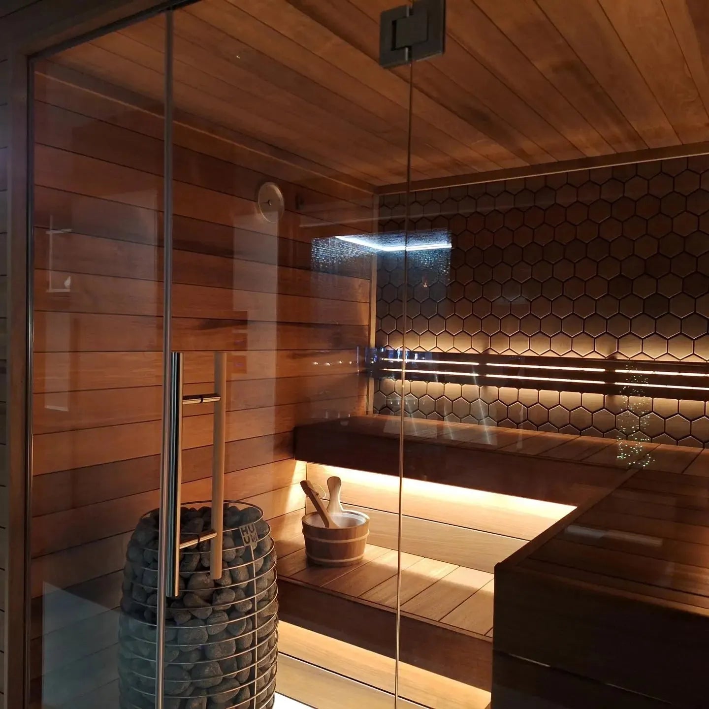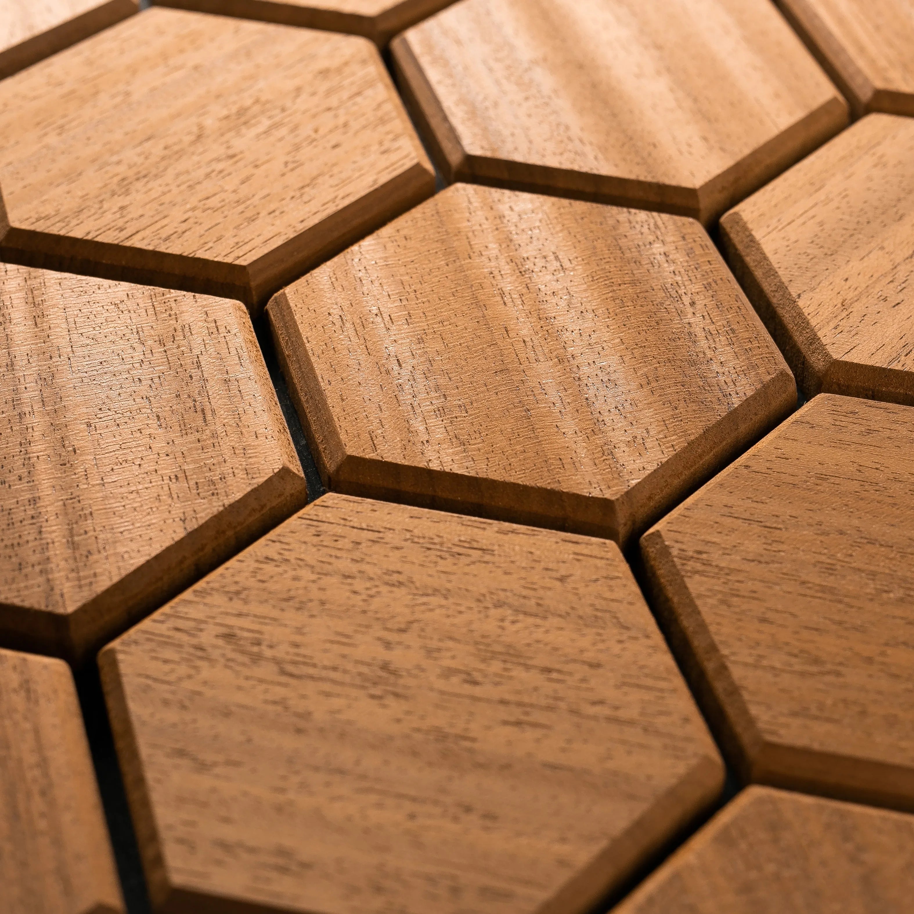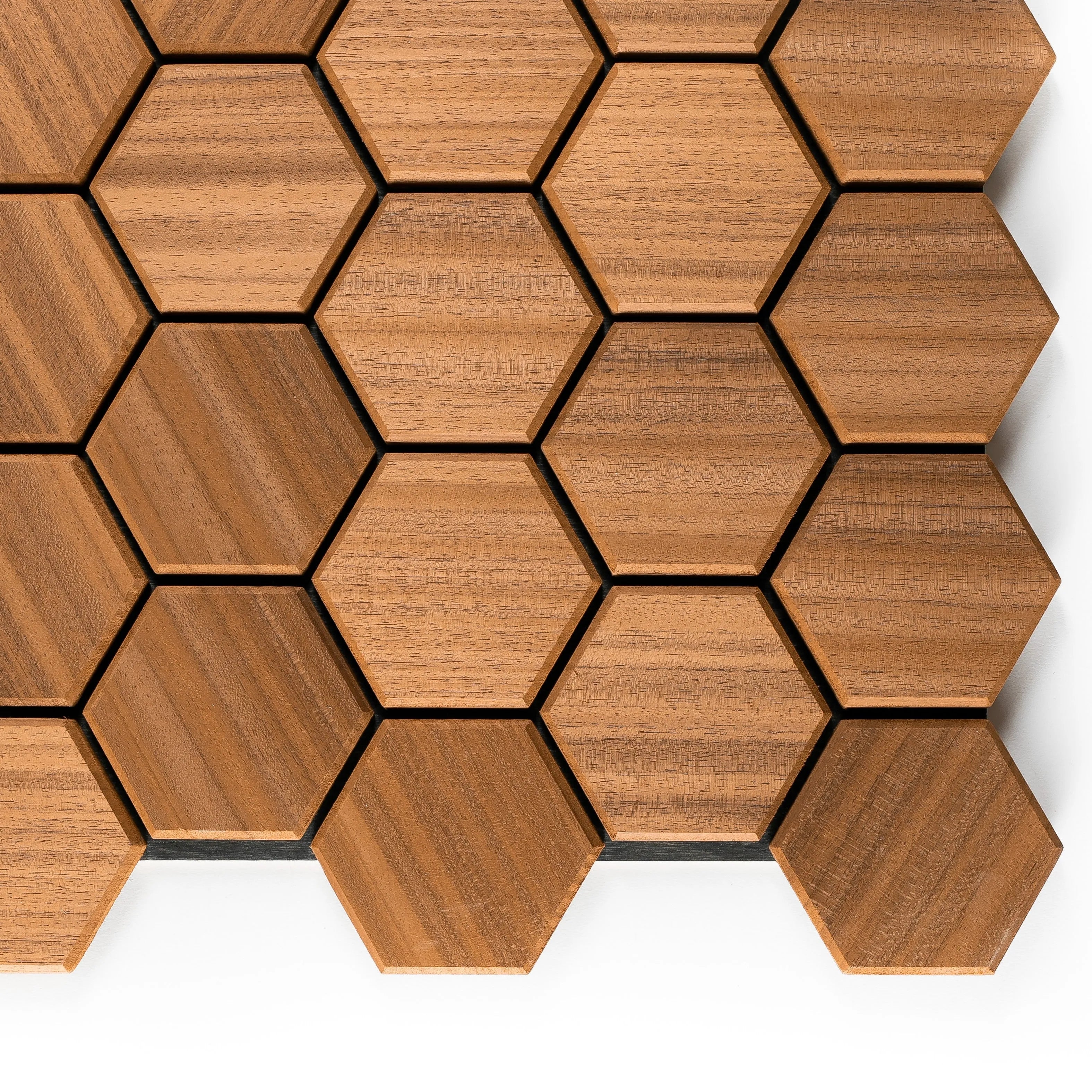 Hexa S Wandpaneele sind hochwertige Dekorpaneele von DecNord. Sie bestehen aus hochwertigem Abachi-Holz und wurden speziell entwickelt, um die Ästhetik von Saunen und anderen Innenräumen zu verbessern. Die Paneele sind in vier verschiedenen Ausführungen erhältlich, jede mit ihren eigenen optischen Merkmalen und ihrem eigenen Charakter. Die Paneele haben die Form regelmäßiger Sechsecke und verleihen dem Innenraum eine angenehme und geometrisch harmonische Note.