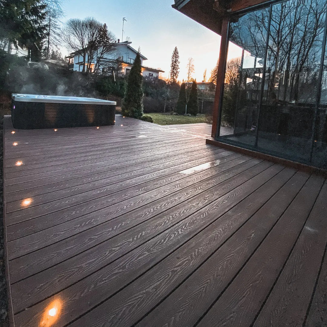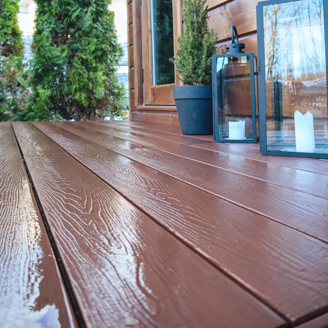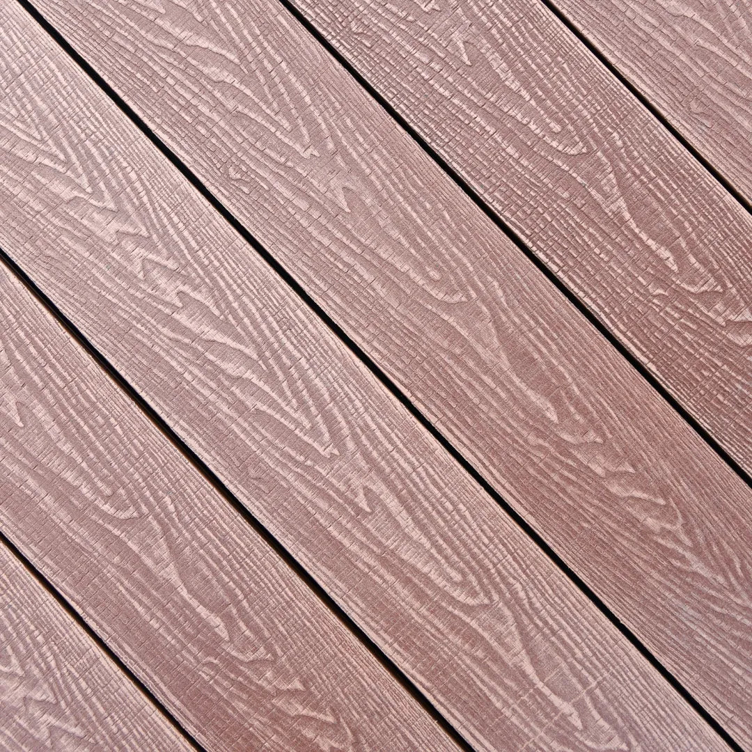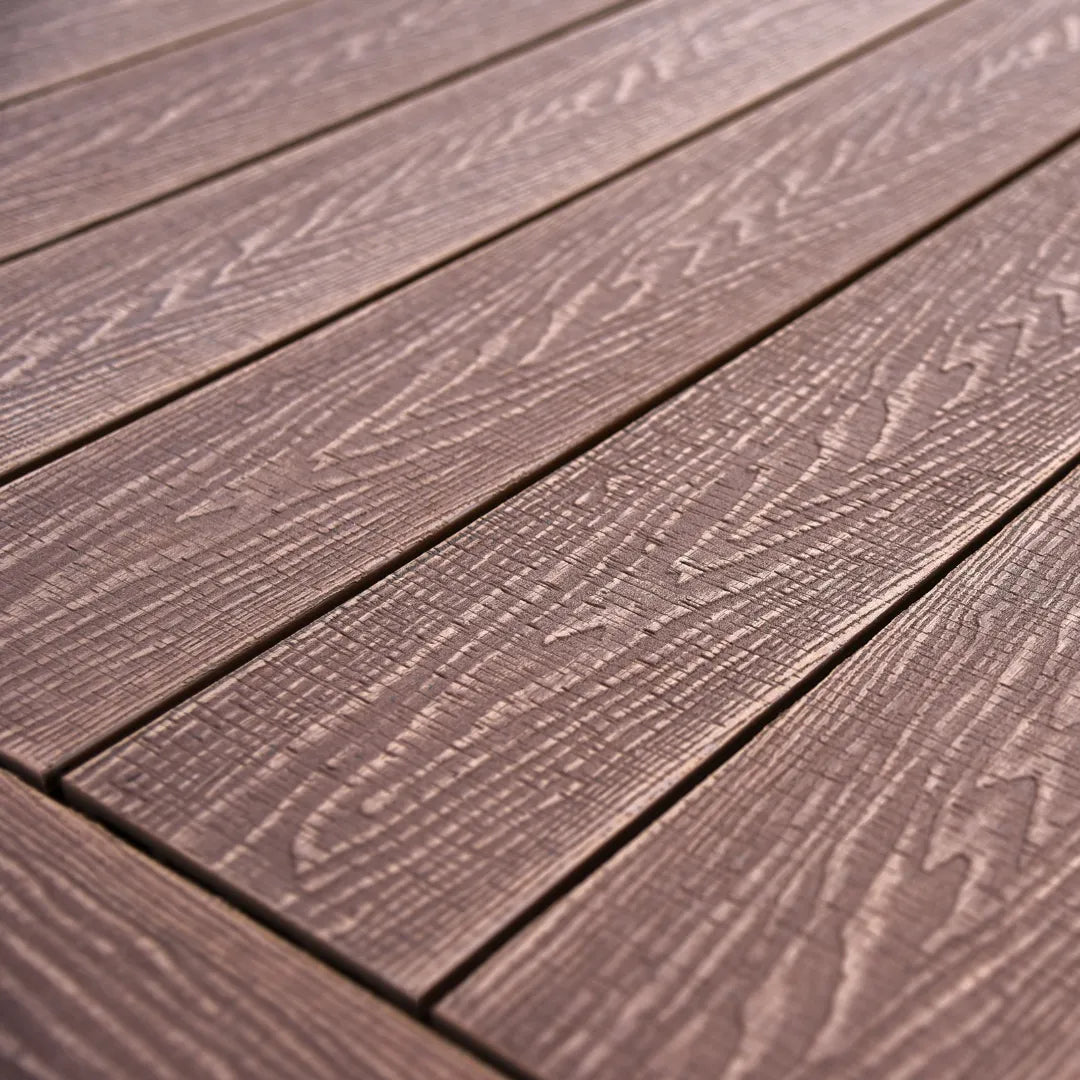 Die neue braune Terrassendiele aus Verbundwerkstoff mit 3D-Muster ist eine einfache Wahl, wenn Sie auf Ihrer Terrasse Haltbarkeit und Pflegeleichtigkeit wünschen.