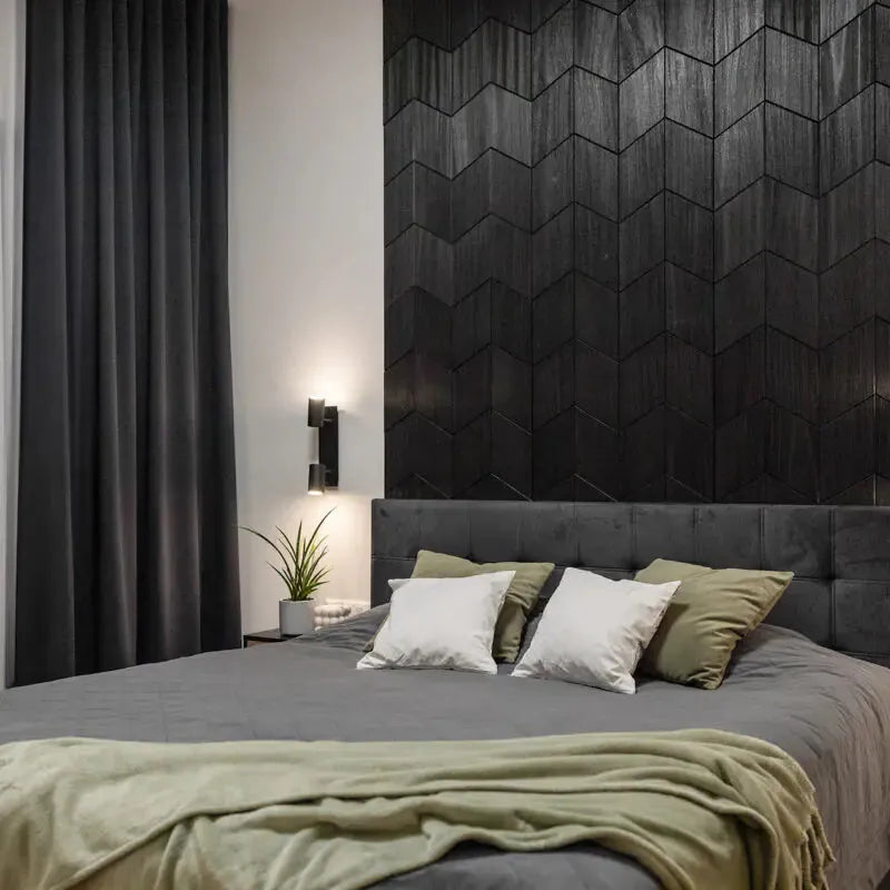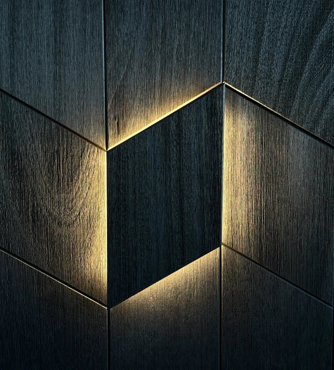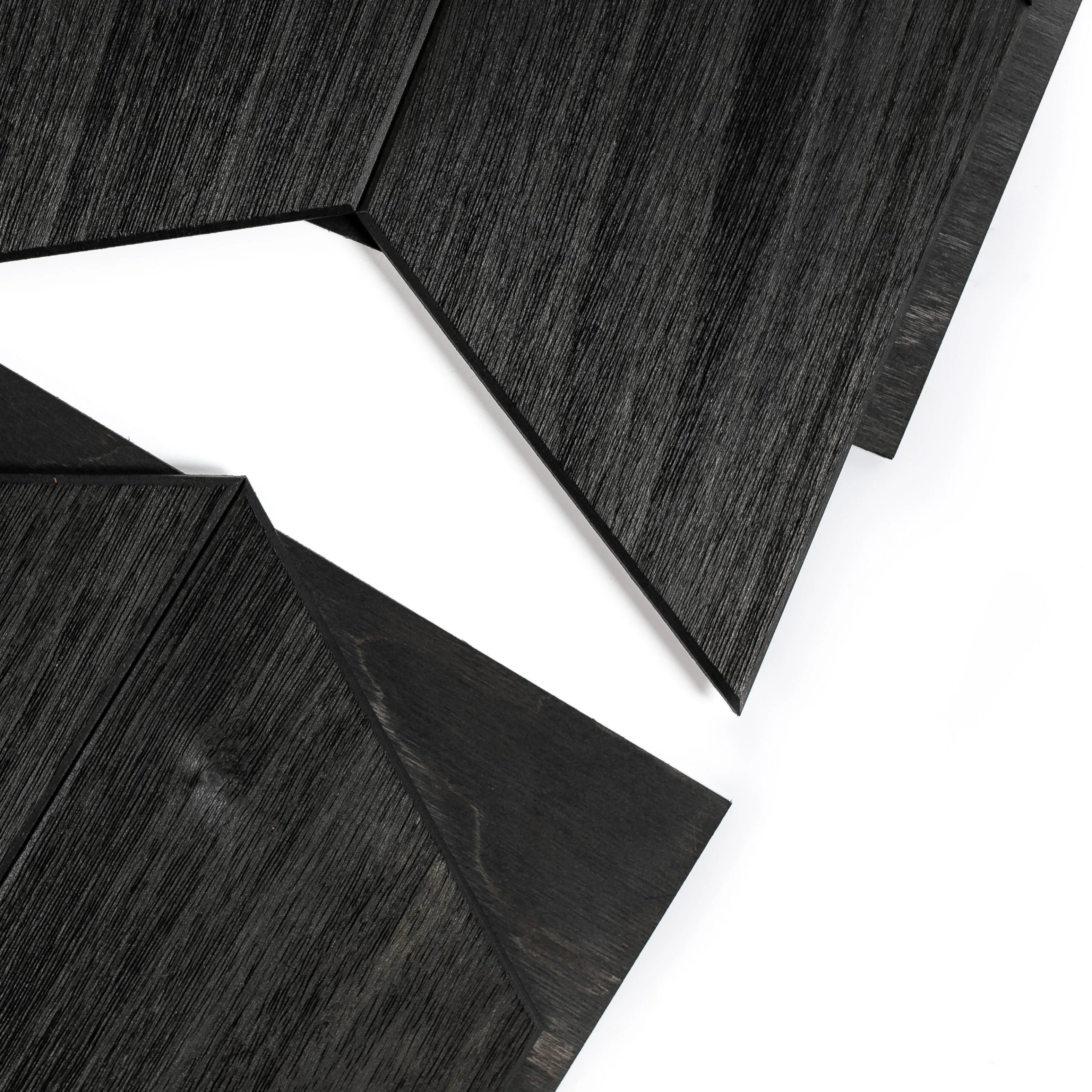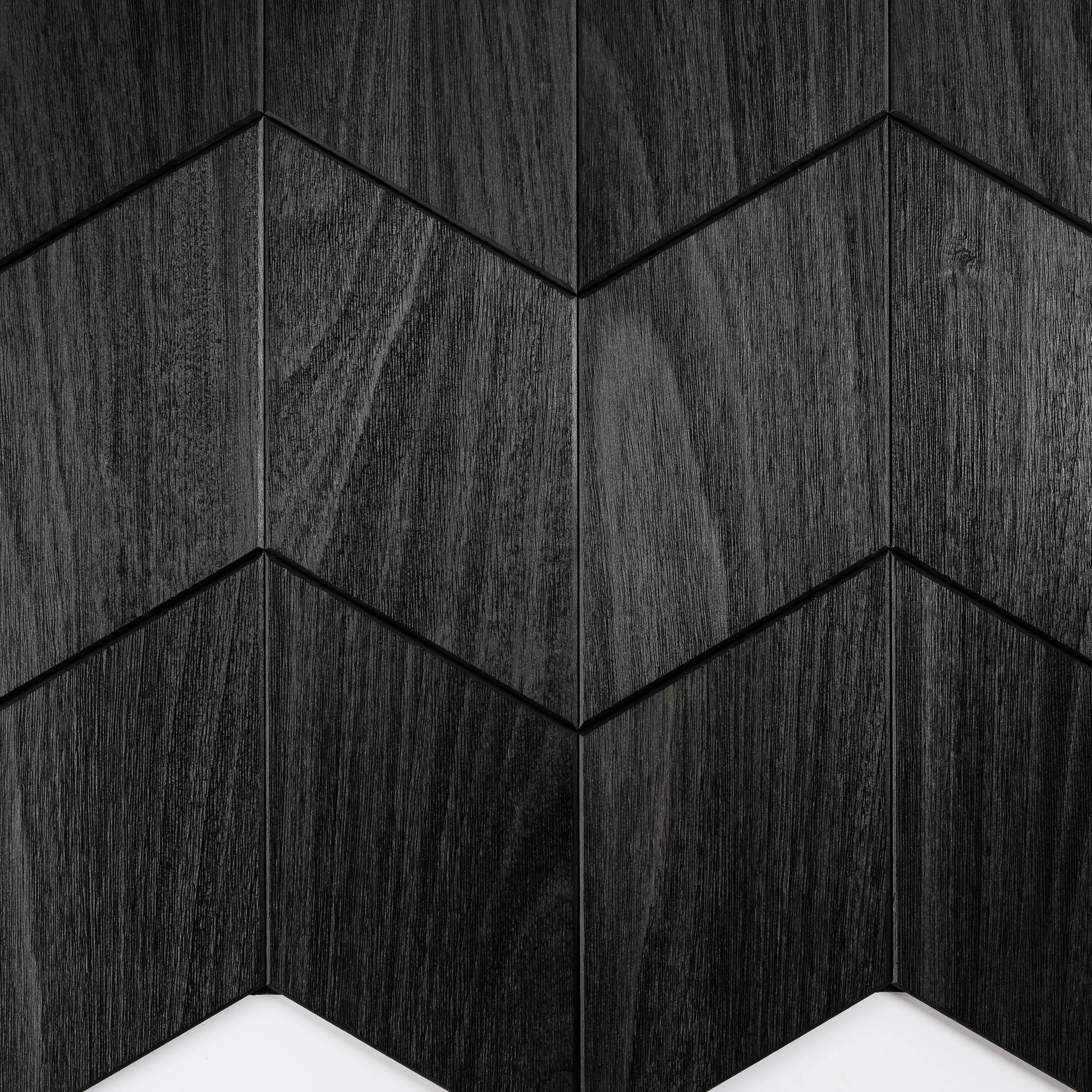 Diese Paneele bestehen aus sorgfältig schwarz gebeiztem Abachi-Holz. Die schwarze Beize unterstreicht die natürliche Schönheit des Holzes und verleiht ihm ein elegantes und modernes Aussehen.